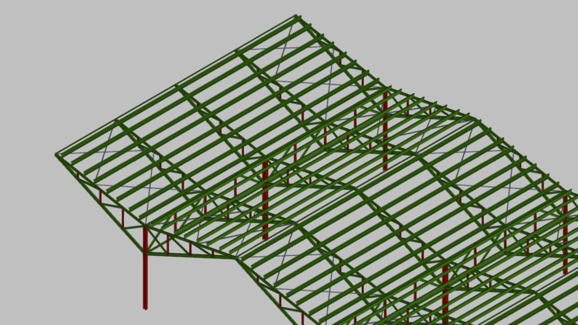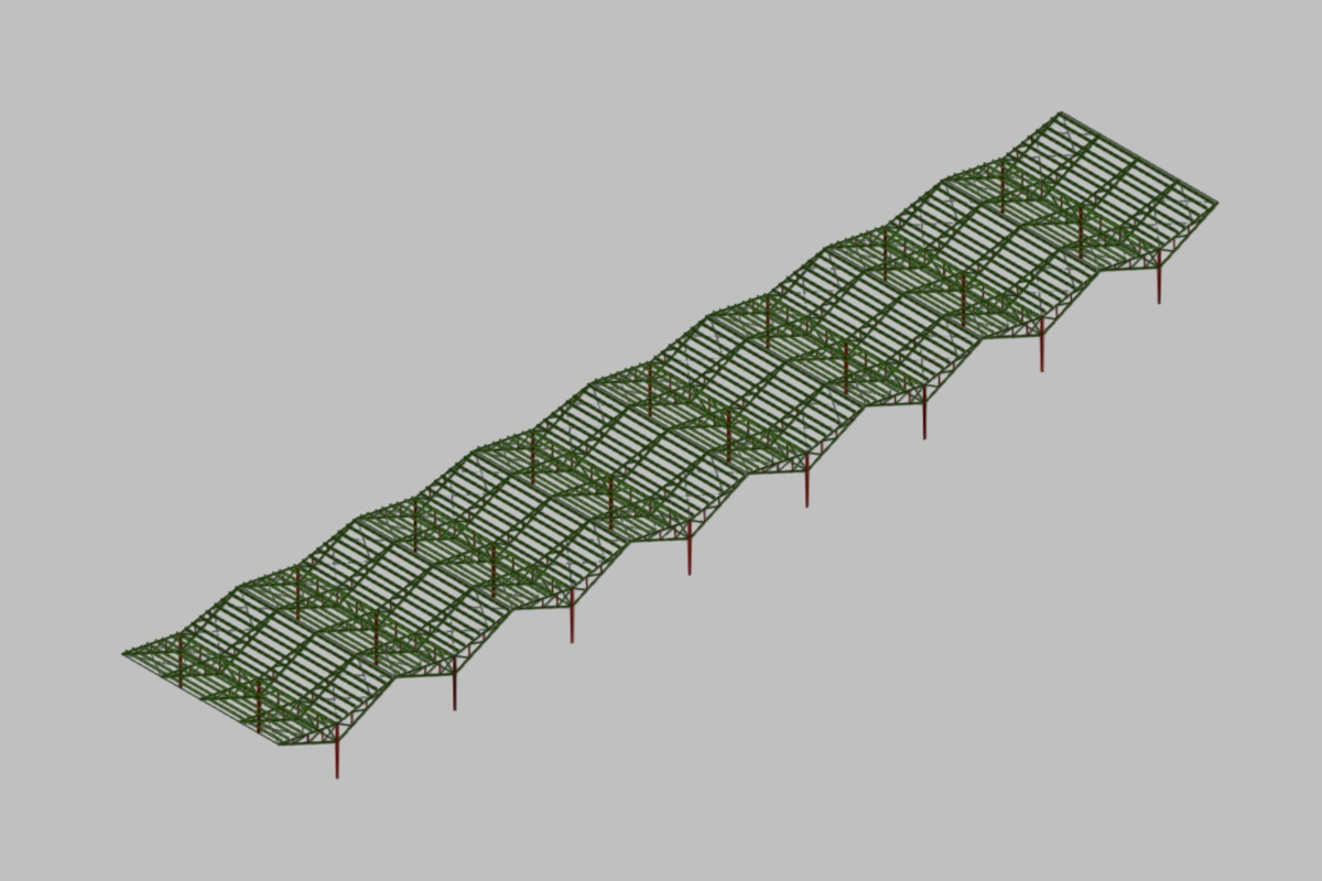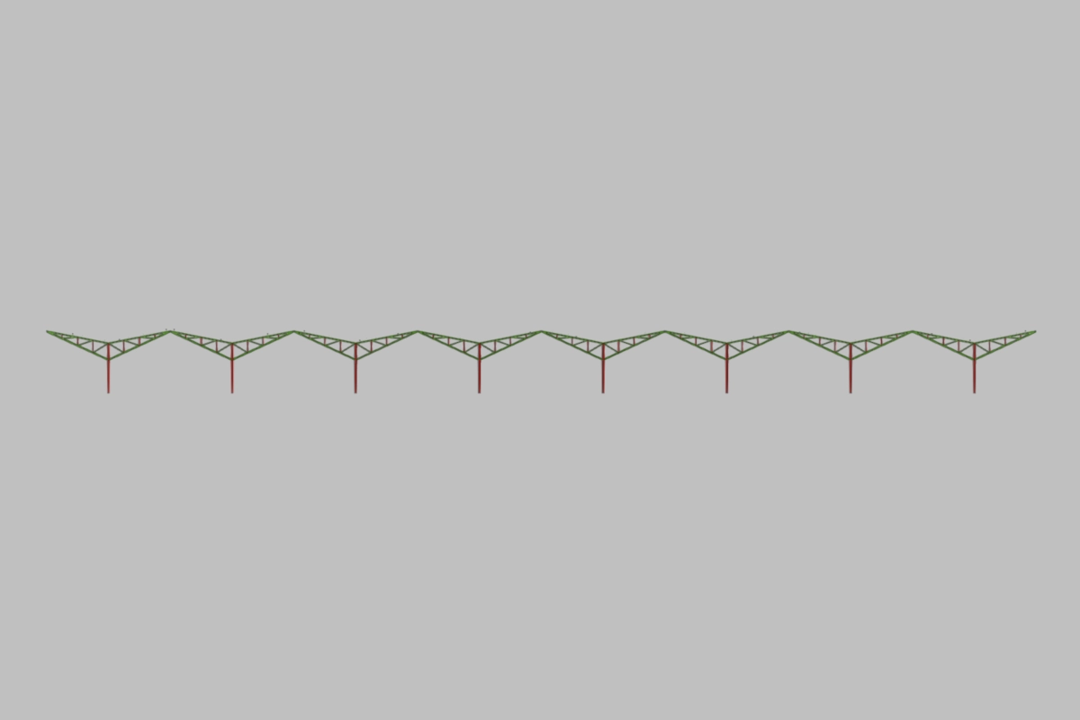 La geometría elegida para el cálculo de estructuras PV en Eslovaquia responde a la necesidad de optimizar acero y montaje. La planta consta de 5 líneas con 8 pórticos en forma de “Y”