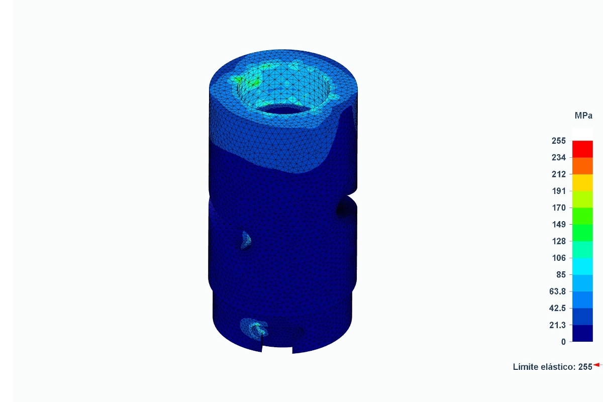 En el caso del útil Sanky, nuestro equipo discriminó entre estas singularidades y las tensiones reales, validando que las zonas de ligera plastificación están confinadas y rodeadas de material elástico, lo que impide la propagación de grietas y asegura la vida útil del componente bajo ciclos repetidos de carga.