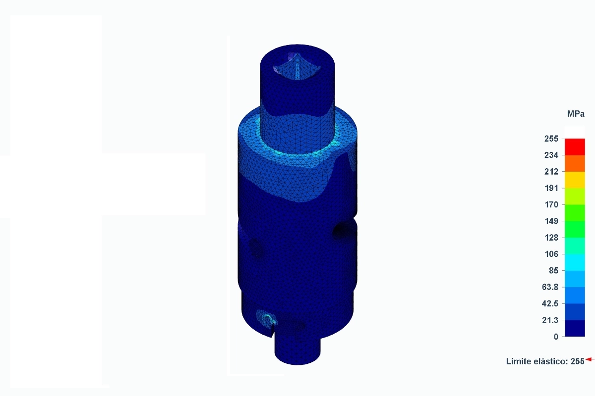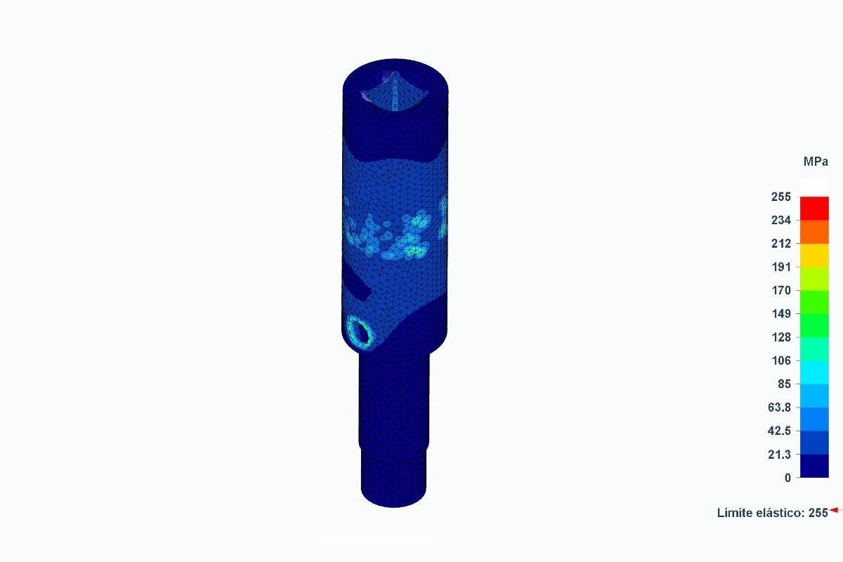 El reto técnico asumido por Atreydes Ingeniería implicaba validar dos útiles en acero inoxidable AISI 304 recocido. Estos componentes debían soportar cargas combinadas críticas: una fuerza de despresurización de 280N y un par de torsión de 80Nm. En entornos industriales de alta exigencia como el de Pimasa, no hay margen de error. Por ello, la integridad estructural de las piezas debía ser absoluta bajo cualquier condición de operación.